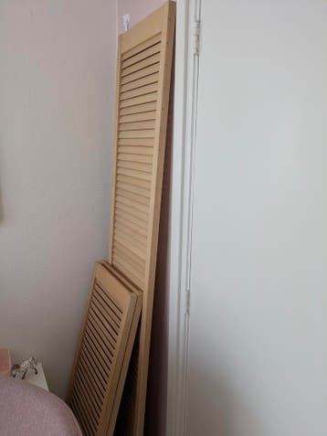 1 lange louvre deur ca 198,3 x 38,2 cm enkele schroef gaatjes aan de zijkant ook nog 2 ingekort ca 38,2 x110,5 cm gratis of voor iets lekkers (bijvoorbeeld thee) op te halen