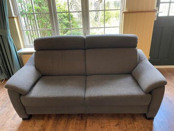 Deze grijze tweezitsbank heeft twee zitplaatsen. De bank is bekleed met stof en heeft een donkere kleur. De armleuningen zijn breed en de bank staat op lage, donkere poten. Afmetingen zijn 196cm breed