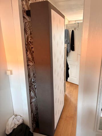 Dit is een onderstel voor een boxspring. Het is 90 cm breed en 200 cm lang. De zijkanten zijn donkergrijs en de bovenkant is wit met een ruitpatroon. Het onderstel is gebruikt.
