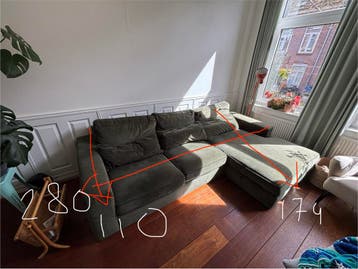 Groene fluwelen hoekbank met een loungegedeelte. De bank heeft een paar gebruikssporen, waaronder een beschadiging aan de onderkant van een kussen. De afmetingen zijn ongeveer 280 cm breed, 110 cm die
