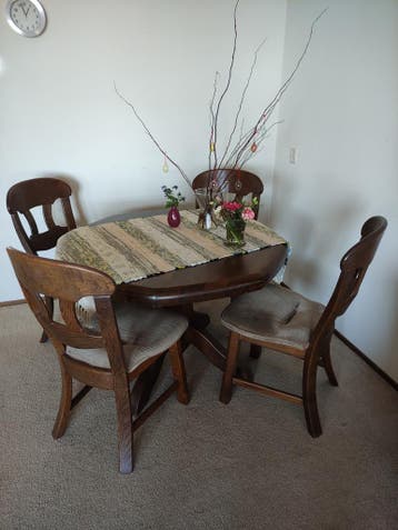Zware houten kwaliteit. Vier stoelen. We kunnen helpen met inladen.