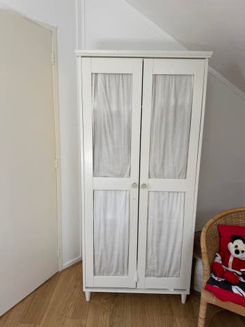 Witte kledingkast die al heel wat jaren meegaat, maar nog prima een ronde mee kan. De stof in de deuren is aan vervanging toe, dus de kast kan een opknapbeurt gebruiken. Ideaal voor iemand die handig