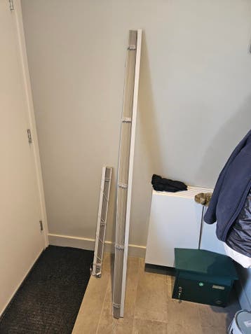 Twee zilvergrijze jaloezieën. Lamelbreedte 25mm. De hoogte is 155cm, de brede is 181,5 cm breed, de smallere 88,5 cm.