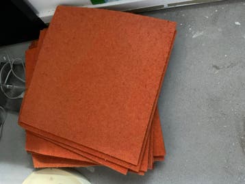 Een stapel oranje tapijttegels. De tegels zijn vierkant en hebben een effen kleur. Er zijn circa 70 tegels beschikbaar en gaan als gehele set.