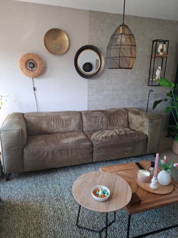 Mooie en comfortabele 2,5-zitsbank in een stijlvolle mosgroene kleur met zwarte metalen poten de bank is gebruikt, maar verkeert nog in goede staat. Materiaal microleer afmetingen 230x75x96