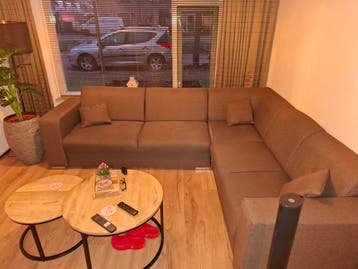 Gratis af te halen: een comfortabele hoekbank. De bank is niet kapot, maar heeft wel wat korreltjes op de zitting, wat normale gebruikssporen zijn. Ideaal voor een studentenkamer, starterswoning of al