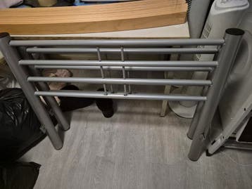 Dit is een eenpersoonsbed met een metalen frame en houten lattenbodem. Het bed is grijs van kleur. Het is een simpel bed, maar nog prima te gebruiken. Het bed is gratis af te halen.