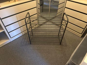 Handig en stevig schoenenrekje van metaal met drie lagen, ideaal voor het opbergen van meerdere paren schoenen. Het rekje is compact en past gemakkelijk in een hal, kast of slaapkamer. Het is in goede
