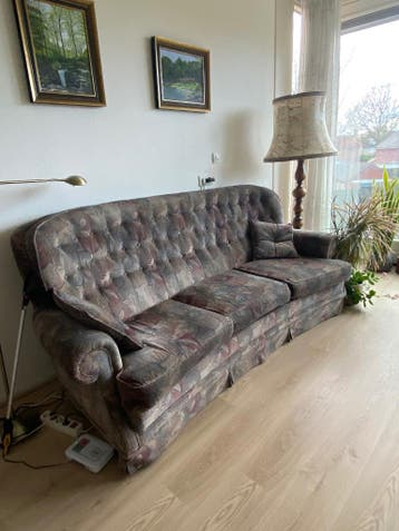 Gebruikte 3 zitbank met klassieke gebloemde poolstof bank is ca. 220 Cm breed. Gratis ophalen ontruiming appartement. Moet deze week weg
