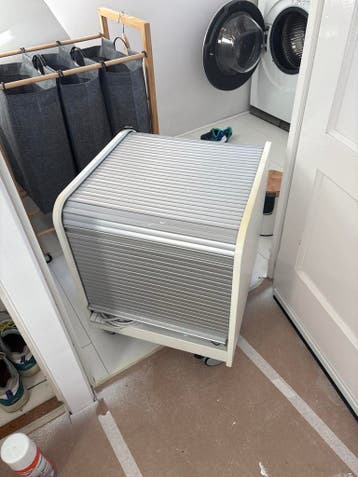 Handig bureau laden blok met roldeur en zwenkwielen. Ideaal voor het opbergen van kantoorbenodigdheden. Afmetingen: 47 cm breed, 60 cm hoog, 50 cm diep. Moet even goed schoongemaakt worden. Exclusief