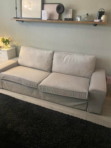 Kivik bank, de bank is grijs van kleur en heeft een stoffen bekleding. Er zijn wat vlekken zichtbaar op de stof, zoals te zien is op de foto's. De bank heeft een rechte ruime vorm en is geschikt 3