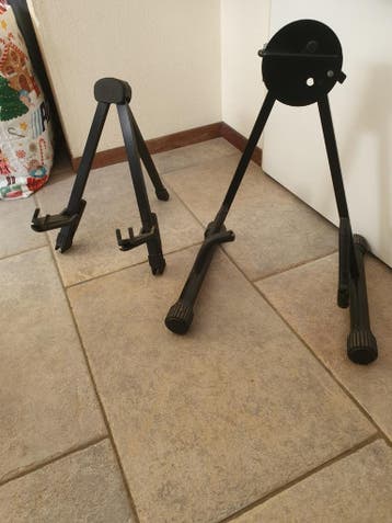 Ik heb twee zwarte standaards voor een gitaar en basgitaar om deze veilig op de standaard plaatsen. Je hoeft niet bang te zijn dat hij omvalt. Of dat de gitaar of bas hals krom wordt. Ik verkoop dit o