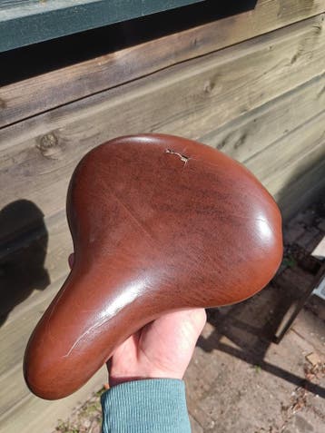 Dit is een bruin fietszadel met veren. Er zit een scheur in de bovenkant en de onderkant is ook kapot. Misschien kan iemand er nog iets mee maken of voor onderdelen gebruiken.