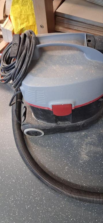 Deze stofzuiger is grijs en zwart. Er zit een slang aan en een lang snoer. Hij is gebruikt en heeft wat stof op de bovenkant.