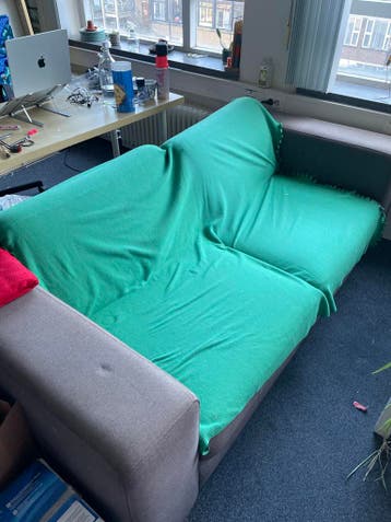 Grijze bank, wat verkleurd door de zon. Er zit een kleine scheur in een van de kussens. Met een deken eroverheen zit de bank nog prima. Ophalen delftseplein in rotterdam. Het is op de 3e verdieping, j