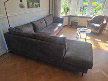 Mooie hoekbank formaat 287 x 220cm kleur groen velvet stof. Na verhuizing pas het niet meer in onze komende nieuwe inrichting.