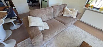 Deze rib / corduroy bank kan nog prima een ronde mee. De bank is gebruikt en heeft wat lichte vlekken op de zitting, zoals te zien op de foto's. Verder ziet de bank er nog goed uit.