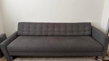 Deze grijze slaapbank is een praktische toevoeging aan elke woonkamer of logeerkamer. De bank is gebruikt en heeft enkele gebruikerssporen, waaronder een beschadiging aan de linkerkant. De leuning lig