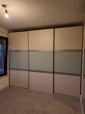 Hierbij bied ik onze kast, kastdeuren met schuifsysteem aan. De totale breedte van de kast is ongeveer 3m. Mocht er belangstelling voor zijn heb ik ook nog kastplanken, roedes en lades er bij. De kast