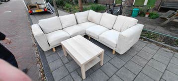 Een hoekbank in lichte kleur. De bank heeft stoffen bekleding en houten pootjes. Er is ook een salontafel te zien op de foto.