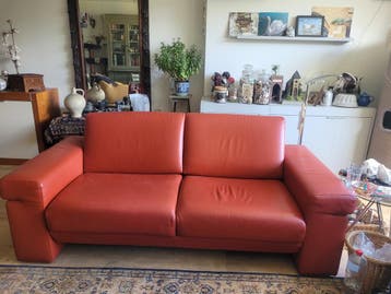 Rode leren bank, tweezits. De bank is gratis af te halen. Zelf vervoer regelen en uit huis halen. Staat op de begane grond.