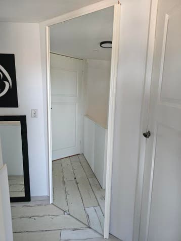 Dit is een grote spiegel die op een plaat gemonteerd is. De spiegel is ongeveer 209 cm hoog en 85 cm breed. Het is een voormalige kastdeur.