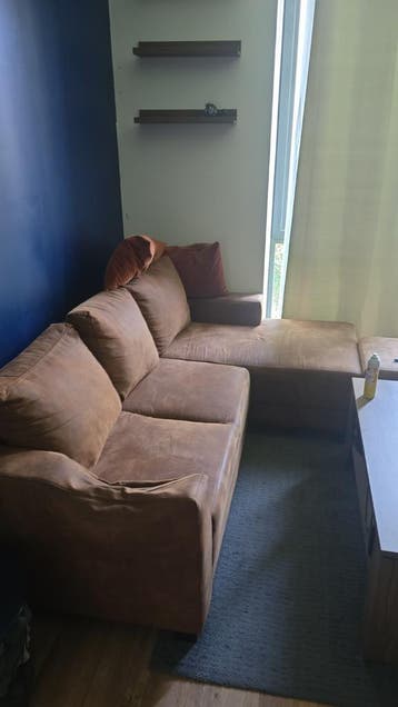 Nette hoekbank met hocker te koop met een wat formelere zit. Ideaal als je liever rechtop en actief zit in plaats van onderuit hangt. Ik krijg dinsdag een nieuwe bank, dus deze moet weg. Let op: leuni