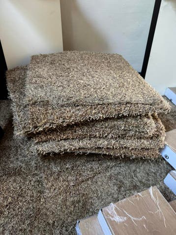 Tapijttegels 50x50 ongeveer 25 stuks sommigen zijn ook hoekje uit er zijn ook een hoop versneden stukken, mocht je die ook willen ruiken wel een beetje muf