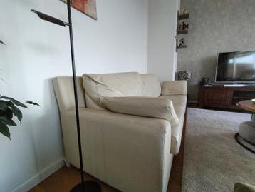 Bank van erg sterk cremekleurig leer zit comfortabel breedte 237 cm, diepte 92 cm., Hoogte 80 cm. Moet snel weg, daarom gratis op te halen.