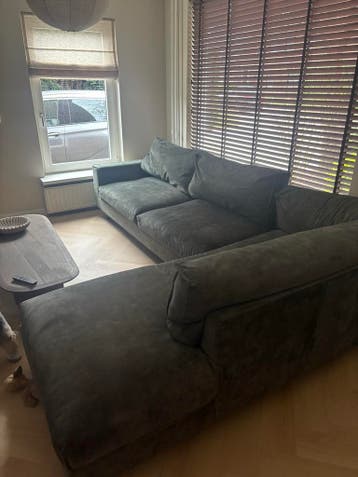 Een donkergroene hoekbank genaamd jonas. De bank heeft een chaise longue aan de rechterkant en is bekleed met stof. Bank is 5 jaar oud, hierbij hebben wel een hond en een kind van 2 gebruik gemaakt va