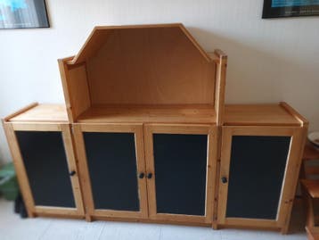 Lundia grenen dressoir/opbergkast. Door gebruik zitten er een paar krasjes op en kleine verkleuringen waar potten hebben gestaan. Afmeting buitenwerks: breedte - 204 cm diepte - 42 cm hoogte zonder ka