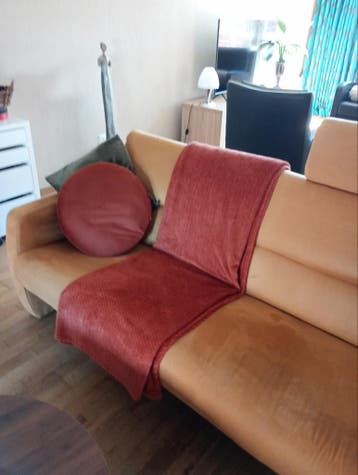 Gratis ophalen. Stevige grote bank. Gebruikt. Afmetingen breedte 182 zitdiepte 50 cm hoogte 80 cm zonder hoofdsteun. Zie de foto's voor conditie. Prima schoonmaken met interieur schuim spray van b
