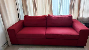 Deze rode bank is 220 cm breed en 90 cm diep. De bank heeft twee zitkussens en twee rugkussens. De stof is rood en de bank staat op donkere poten. De bank is gratis op te halen.