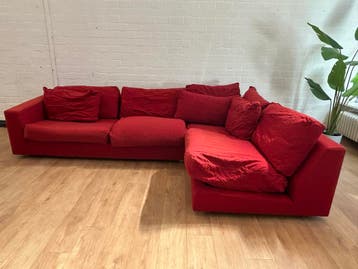 Deze rode pode hoekbank is professioneel gereinigd, maar er zijn nog wat huisdierharen aanwezig. Tijdens het wassen van de kussens zijn enkele ritsen kapot gegaan. De kussens zijn niet goed teruggeduw