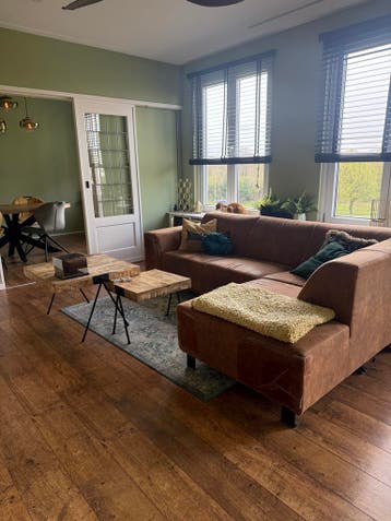 Bruine hoekbank. De bank is gebruikt en heeft wat beschadigingen door katten. De onderkant is kapot door krabben. Aan de zijkanten zit nog anti-krab folie, dit kan eraf gehaald worden.