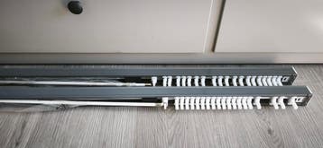 Lamellen van 229 cm lang. Er zijn twee ophangrails van 150 cm (nieuw in verpakking) en een ophangrail van 274 cm. Alle delen zijn makkelijk in te korten. De lamellen (antraciet) zijn wel gebruikt. All