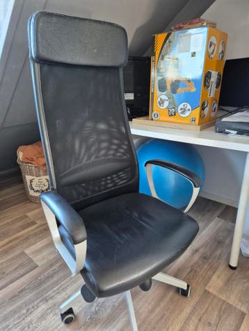 Een zwarte bureaustoel met een gaas rugleuning en een zitting van een ander materiaal. De stoel heeft armleuningen en wieltjes. De stoel is in gebruikte staat.