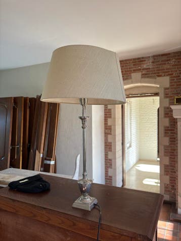 Deze tafellamp heeft een zilverkleurige voet en een lichtgekleurde stoffen lampenkap. De lamp staat op een vierkante voet en heeft een klassieke uitstraling. Het snoer is zwart.