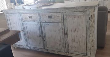 Stevige kast/dressoir 1.90M breed 0.50M diep 0.95M hoog met legplank, 4 deuren en 2 lades (kattenluikje in de linkerdeur)