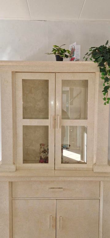 Mooie witte stenen kast met ingebouwde verlichting. De bovenkant van de kast staat los op de onderkant, wat handig is voor transport. Er zijn enkele beschadigingen aan de hoekjes, maar verder is het e