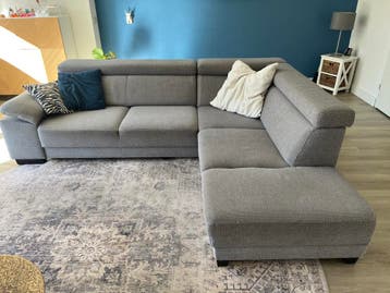 Grijze hoekbank, gebruikt, maar zit erg fijn! De hoofdsteunen kunnen rechtop, maar ook plat.