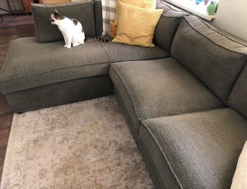 Gratis hoekbank (zonder de kleine, losse sierkussentjes) maten 283 × 90 × 197 cm kleur warmgroen/olijfgroen winkel: basic label woood freddie hoekbank (merk), nieuwprijs was € 1255,00 beschadigd