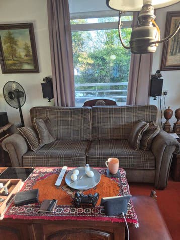 Deze 3-zits bank is bekleed met stof en heeft een ruitjespatroon in bruine en beige tinten. De bank is 2 meter breed en in goede staat. Er zitten ook twee kussentjes bij.