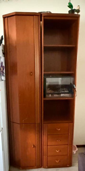 Complete houten meubelset bestaande uit twee hoge kasten en één lage kast. Eén van de hoge kasten heeft een schuine kant, ideaal voor een hoekopstelling. De lage kast is voorzien van een handige val d