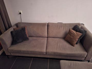 Zitbank met een bijpassende hocker. De bank is grijs van kleur en heeft twee zitplekken. Er zitten ook vier sierkussens bij, twee donkergrijzd kussens en twee bruine kussens. De bank staat op zwarte p