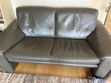 Gratis af te halen. Bank van skai leer. De bank heeft twee zitplaatsen en is grijs van kleur. Er zijn wat gebruikssporen zichtbaar op het zitvlak. Maten: 160 cm breed en 85 cm diep (waarvan zitgedeelt