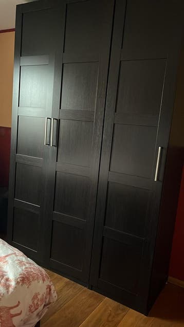 Een donkerbruine kledingkast met drie deuren. De kast heeft zilverkleurige handgrepen. De deuren hebben een paneeldesign. De afmetingen zijn 2.36 Cm hoog en 1.50 Breed.