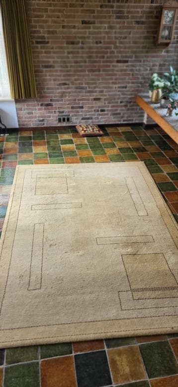 Mooi beige tapijt met een modern, abstract patroon. Het tapijt is in goede staat en komt uit een rookvrij huis. Ideaal voor de woonkamer of slaapkamer om een warme sfeer te creëren. Afmetingen zijn on