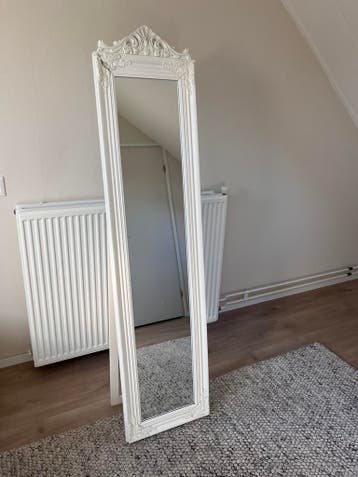 Gratis af te halen: grote witte passpiegel met sierlijst (brocante stijl). De spiegel is nog goed bruikbaar, maar de lijst is aan de bovenkant beschadigd (zie foto).