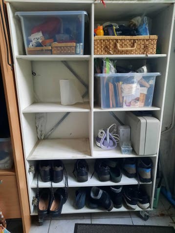 Handige witte kast op wielen met diverse schappen en vakken, ideaal voor het opbergen van mandjes of schoenen. De kast is nog in goede staat, maar kan een schoonmaakbeurt gebruiken. Afmetingen: 158x99